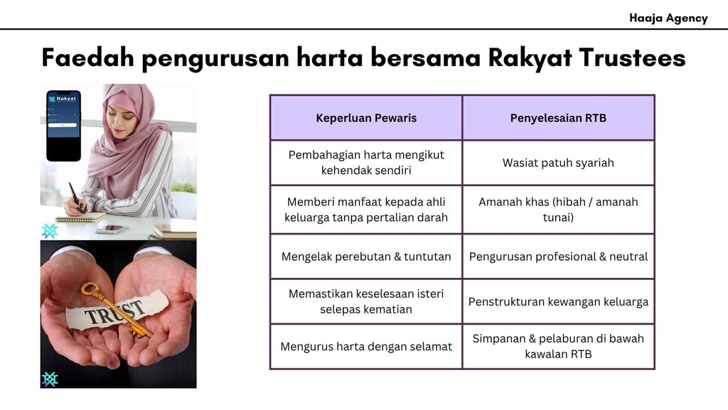 Sebagai perunding berlesen di bawah Rakyat Trustees Berhad (RTB), kami membantu anda merancang, melindungi dan mengagihkan harta dengan cara yang sah dan patuh Syariah.